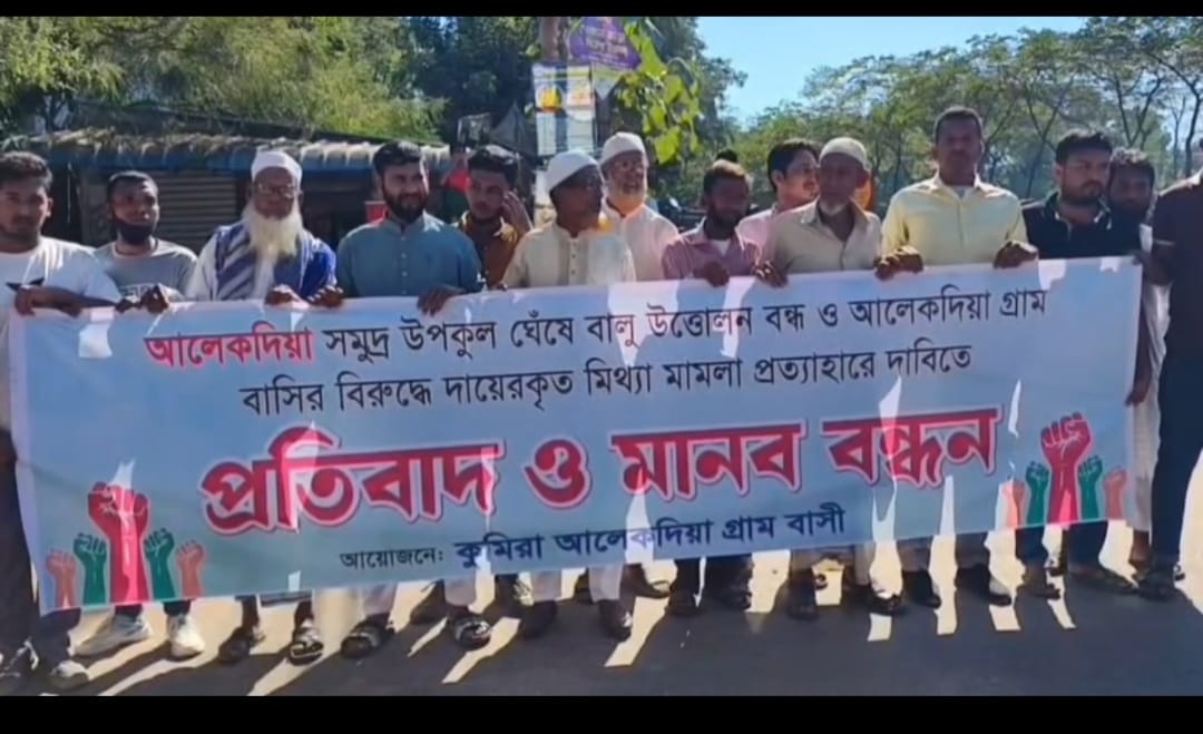 সীতাকুণ্ডে অবৈধ বালি উত্তোলন বন্ধ ও মিথ্যা মামলা প্রত্যাহারের দাবিতেএলাকবাসির মানববন্ধন