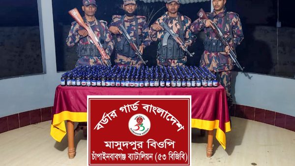 চাঁপাইনবাবগঞ্জ সীমান্তে ৫৩ বিজিবির অভিযানে বিপুল পরিমাণ ভারতীয় নেশাজাতীয় সিরাপ জব্দ চাঁপাইনবাবগঞ্জ প্রতিনিধি চাঁপাইনবাবগঞ্জ সীমান্ত এলাকায় মাদকবিরোধী অভিযানে বিপুল পরিমাণ ভারতীয় নেশাজাতীয় সিরাপ জব্দ করেছে বর্ডার গার্ড বাংলাদেশ (৫৩ বিজিবি)।
